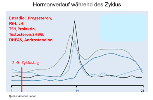 Der optimale Zeitpunkt für die Hormonbestimmung ergibt sich aus dem Hormonverlauf während der Periode: